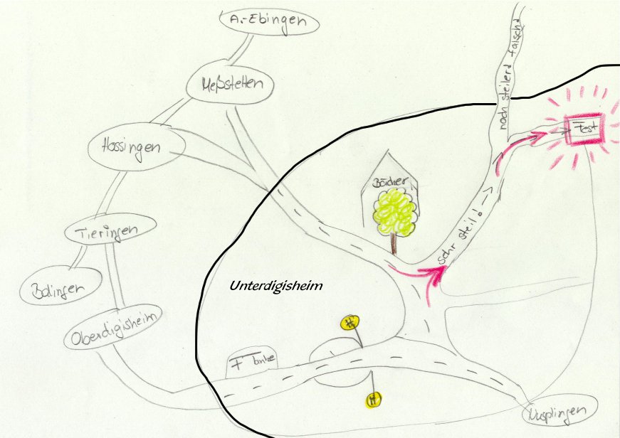 Dann müsst ihr eine Weile geradeaus fahren, und irgendwann (wenn man fast schon nicht mehr daran glauben